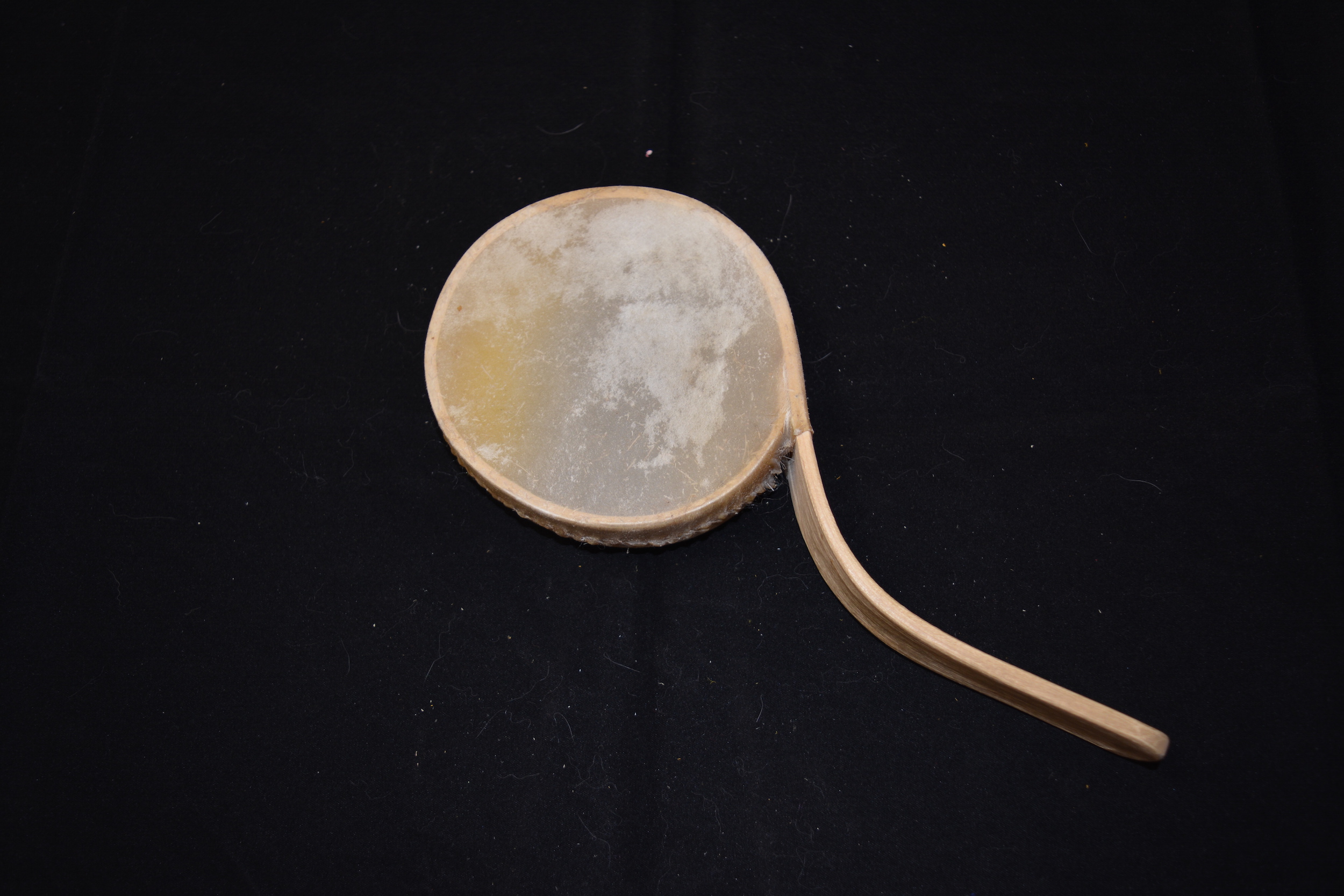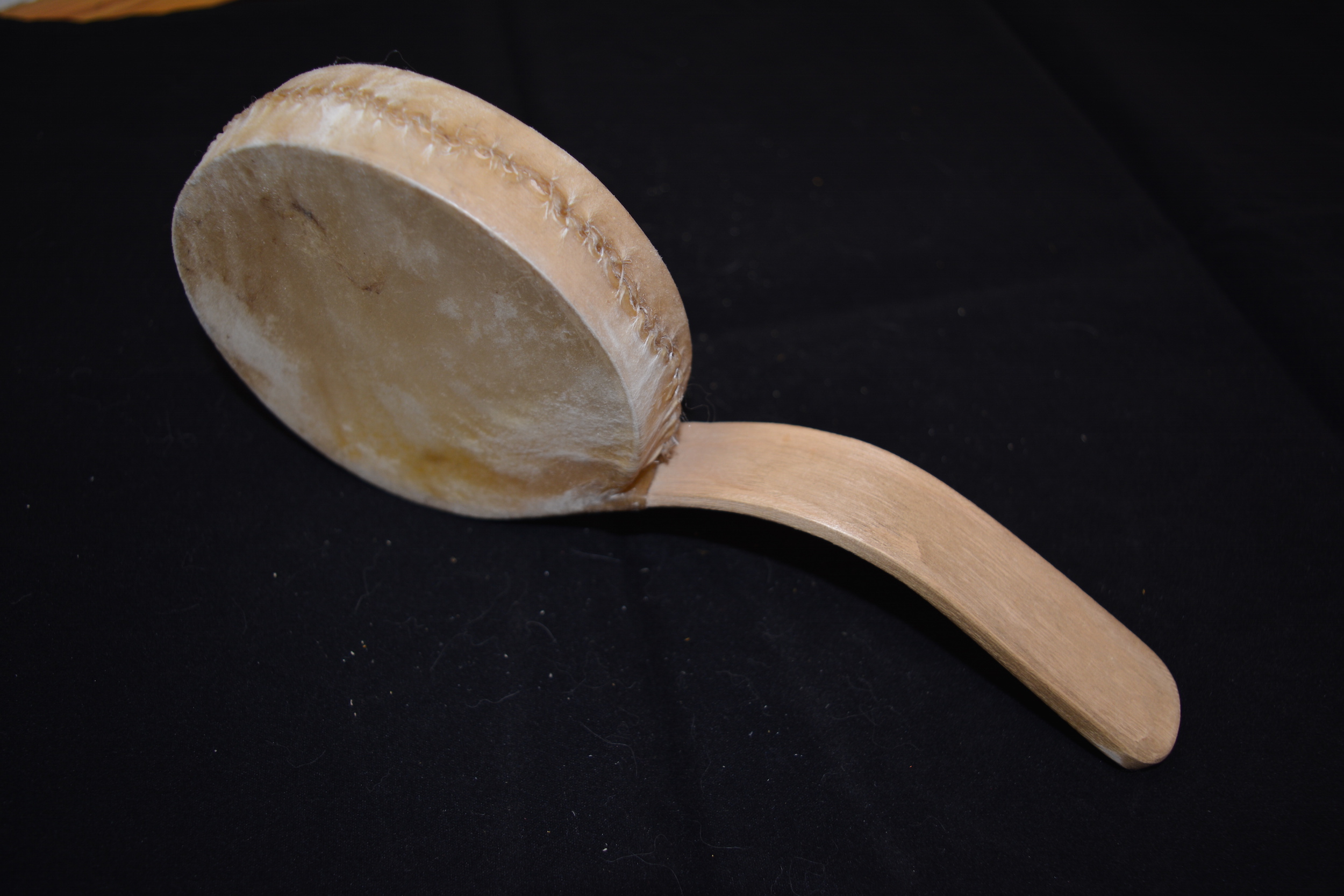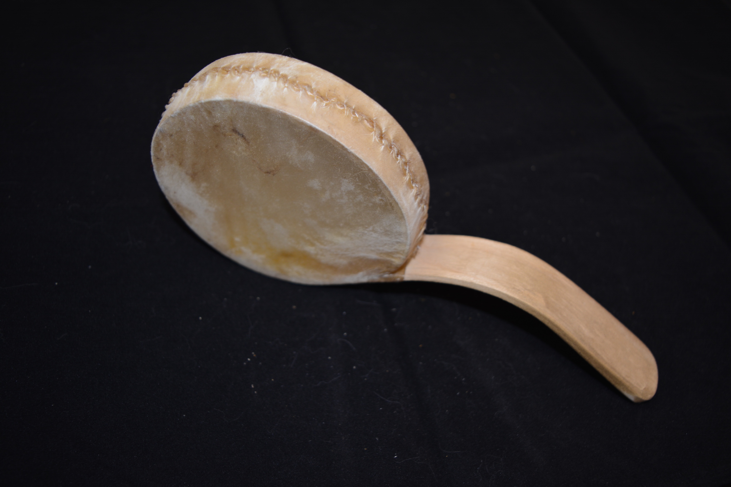 This is a toy that is spun over the head like a sling to make a whirling sound. It is made from a Moose knew bone.