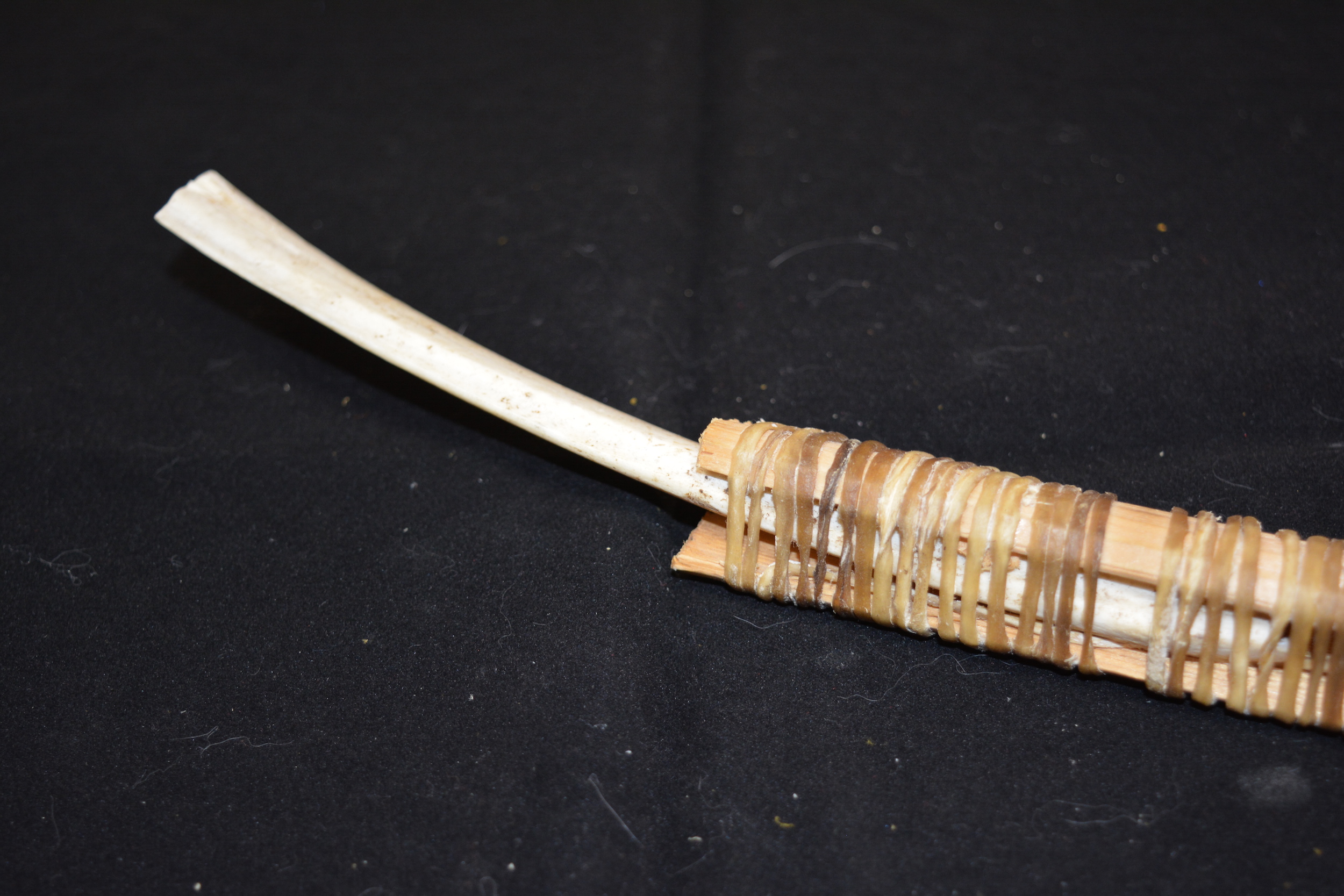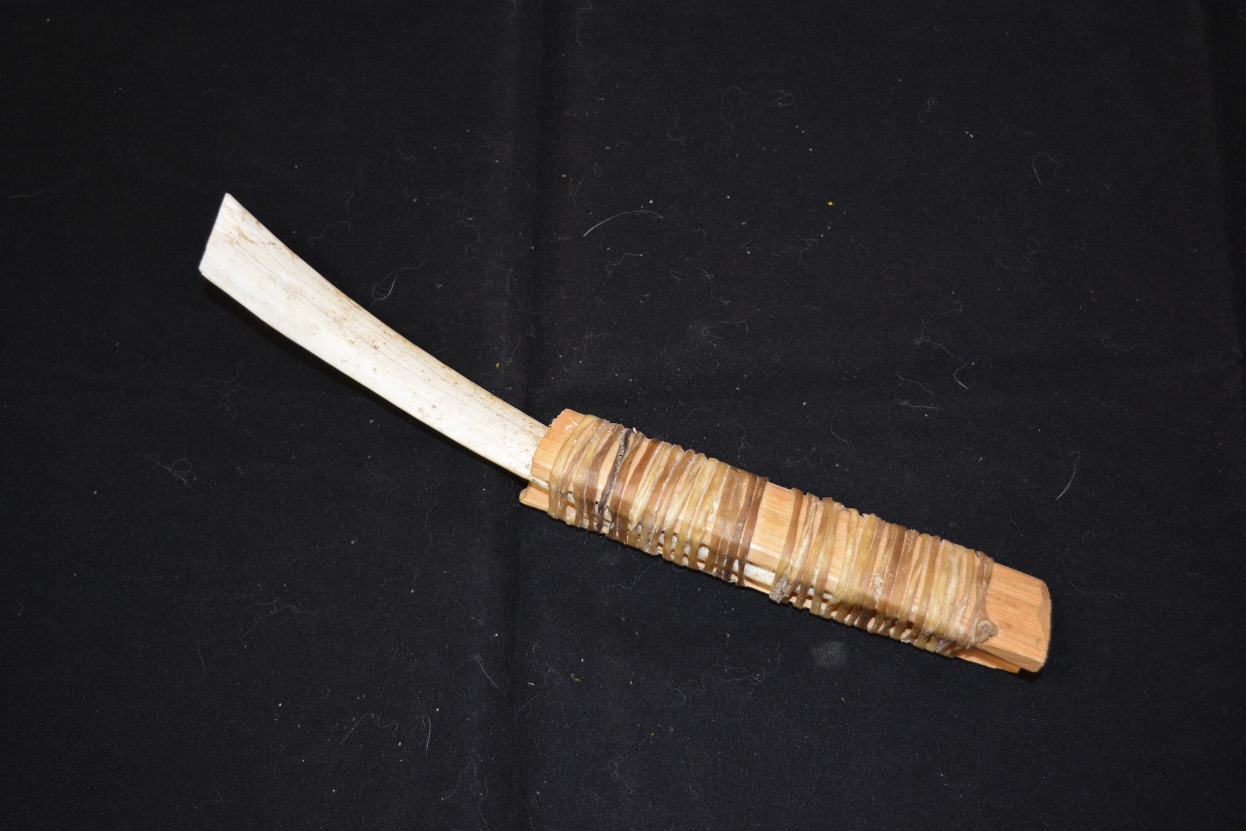 This knife is made from the rib bone of a Caribou.  The Hudson’s Bay Company later fabricated this style of knife using metal.